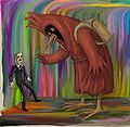 Только упороться, только одуплиться. Всё вокруг струится, меняются границы, И над этим городом — тень огромной птицы. Ростом стал он где-то метра три, Загорелись очи, как огни, Был на друге красный балахон, За спину рюкзак повесил он, Стал подобен лик его углю, А из середины вырос клюв. В этом городе нельзя остановиться, Только упороться, только одуплиться. Всё вокруг струится, меняются границы, И над этим городом — тень огромной птицы. Я сознанье мигом потерял, А когда очнулся — друг пропал, Я же очутился невесть где, Может даже и не на Земле. Это был какой-то город снов, Разноцветный лабиринт домов. В этом городе нельзя остановиться, Только упороться, только одуплиться. Всё вокруг струится, меняются границы, И над этим городом — тень огромной птицы. К огромному щиту я встал лицом, «Омск» было написано на нём. А вокруг, спеша, проходят люди, Все во власти радостных иллюзий. Трясутся, руки спрятаны в карманы, Сразу видно — это наркоманы! |