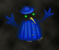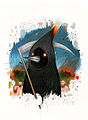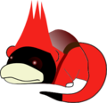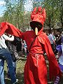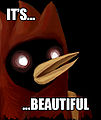 Омская птица носит красное одеяние с трёхрогим колпаком и ранец за спиной. Содержимое ранца неизвестно, хотя некоторые художники рисовали выглядывающую из него лоли. Алсо, в средние века Смерть, в ее классическом виде скелета с косой, иногда изображали с похожим бэкпаком за спиной — в нем располагались малогабаритные орудия труда тогдашних жнецов (Смерть какбэ является «Мрачным жнецом» — «Grim Reaper» же).