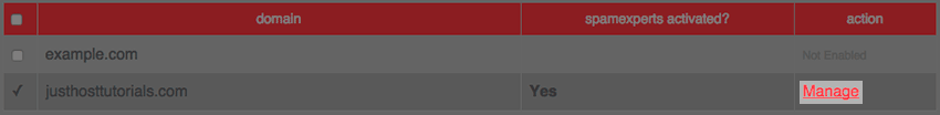 - Click Manage, to the right of your Domain Name, to login to the SpamExperts Dashboard.