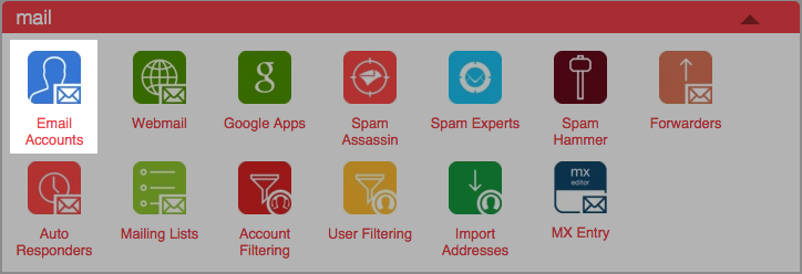 - Open the Email Accounts tool, located in the Mail section of the cPanel.