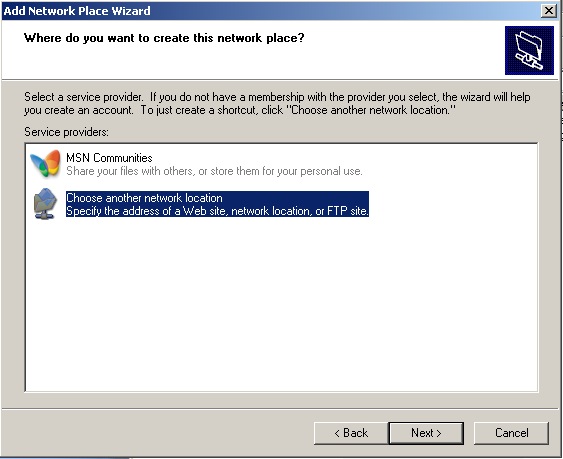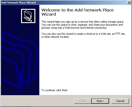 - A new screen will pop up reading Welcome to the Add Network Place Wizard, click Next.