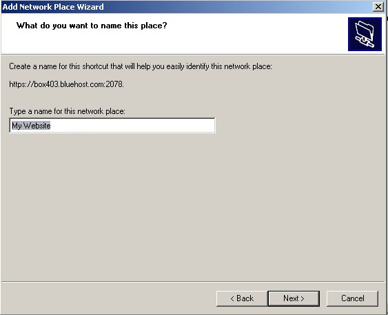 - You will then need to name the network place, name this anything you want. (ie. My Webdisk to 'foldername'). In the Type a name for this network place: field, type My Webdisk to 'foldername'. Replace 'foldername' with the folder name your Webdisk is accessing, click Next.