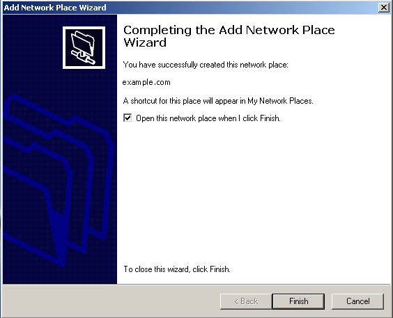 - You will then come to Completing the Add Network Place Wizard, click Finish.