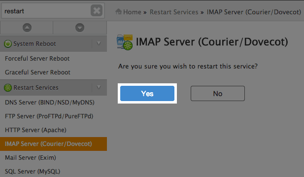 Searching restart in the WHM. - Click the "Mail Server (Exim)" link.