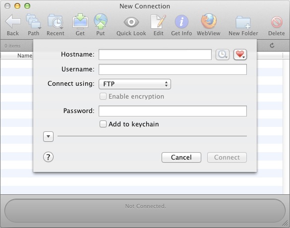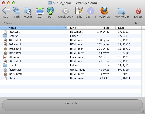 The easiest way to copy files to and from the server is to simply drag-and-drop them using Finder. You may also use the program's Get and Put icons to upload and download from the current folder.