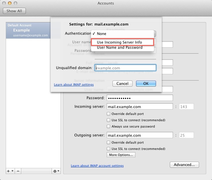 - From the Authenticationdrop-down menu and choose "Use Incoming Server Info"