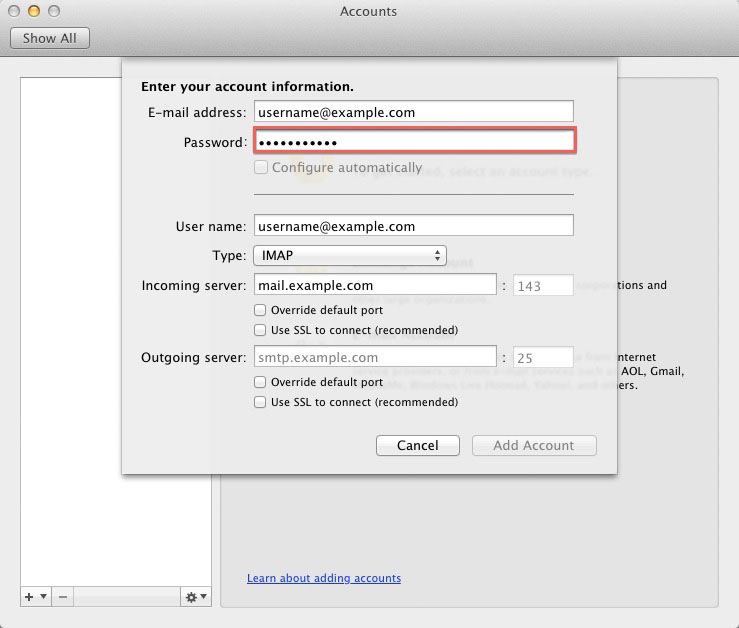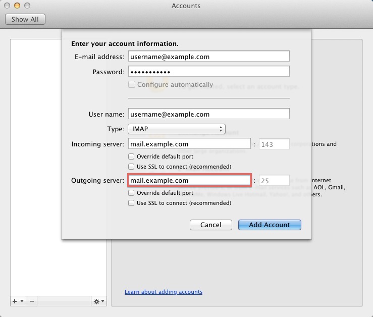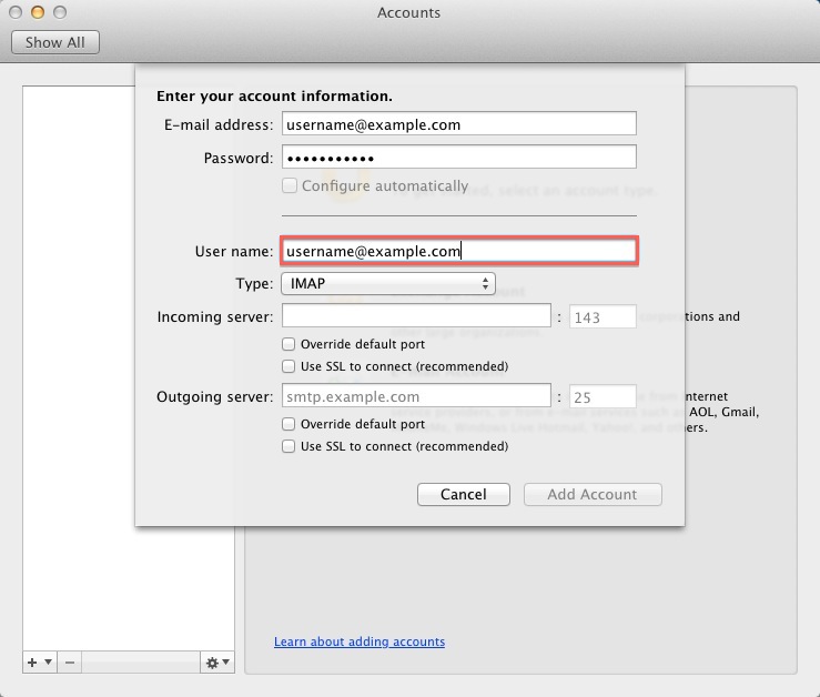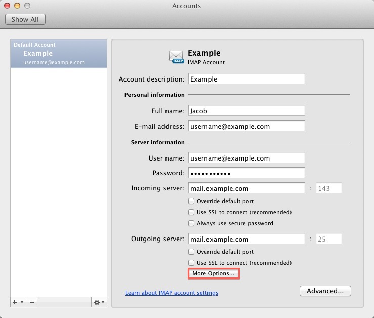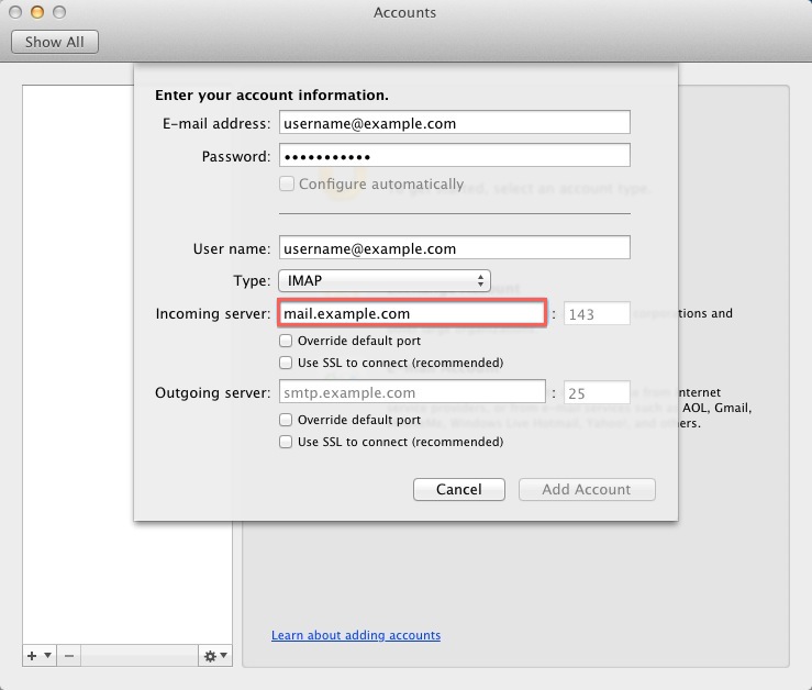 - Incoming server: This is typically your domain name preceded by "mail.". This can be found in the E-mail Accounts section of the cPanel, under More > Configure Mail Client.