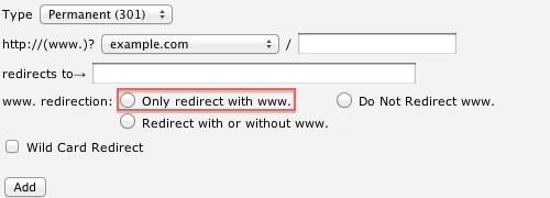- "Only redirect with www."This option will only redirect visitors that use www. as part of the URL