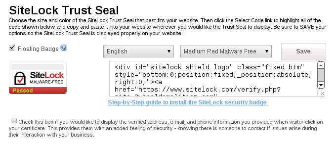 - Floating Badge Checkbox: With the checkbox checked, your seal will float on the page. These means that the seal will always stay in the bottom right corner of the website and regardless of where the user scrolls on the page.