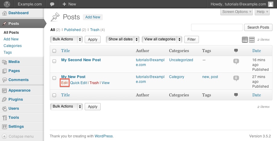 - On the WordPress Dashboard click All Posts under Posts. This will list all the posts that have been made, whether published or drafts.