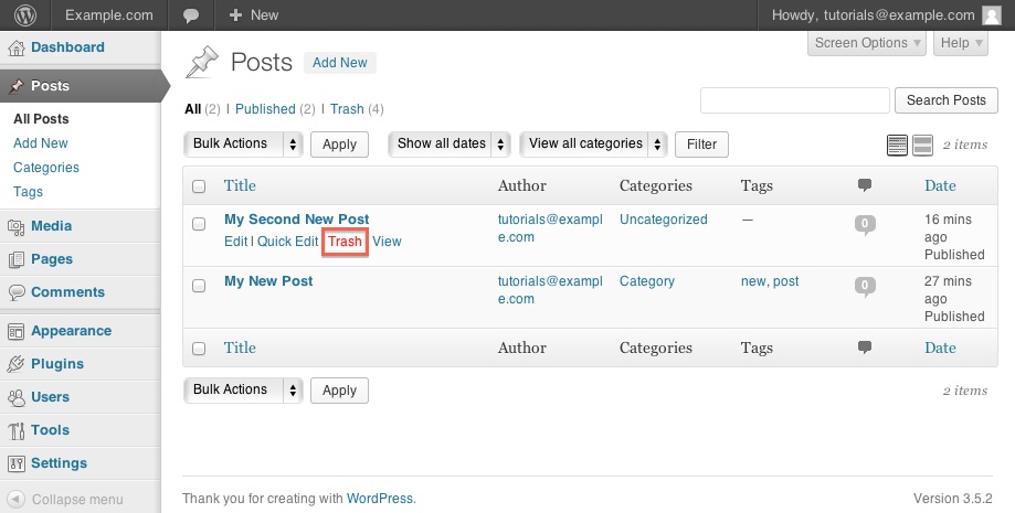 - Mouse over the Post and click Trash.