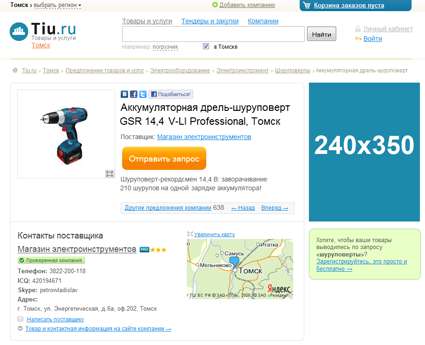 На сайте Tiu.ru возможно размещение баннеров формата 240х350.