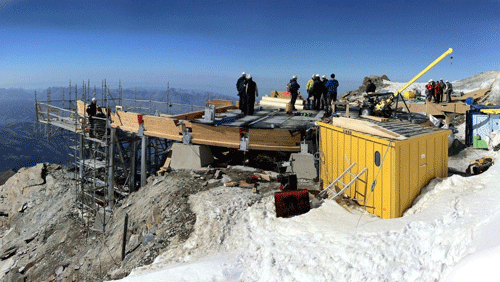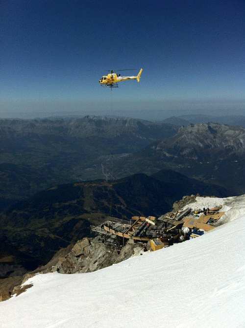 Du futur bâtiment compact et ovoïde à quatre étages, couvert de panneaux en inox brossé miroitant sous le soleil, on n’aperçoit pour l’heure que douze plots de béton coulés autour de pieux qui s’enfoncent d’une dizaine de mètres dans le permafrost. «Les assises de l’édifice», explique Anthony Gros, ingénieur de Charpente Concept, la société qui assure, avec les architectes genevois du groupe H, la maîtrise d’œuvre du chantier. Ce matin, les cinq hommes au travail apprécient des conditions météo idylliques, rares en cette fin septembre : grand soleil et douceur de l’air. Dans le ciel ourlé de nuages, glisse nonchalamment un planeur. Seul le cri des choucas et, au loin, un bruit sourd de séracs qui s’effondrent, trouble le silence. La grande plateforme excavée dans l’arête neigeuse par une pelle araignée fait face à l’aérienne aiguille de Bionnassay.