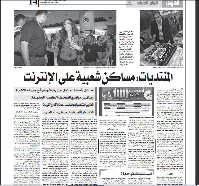 ![]() لكل اعضائنا الكرام اهنئكم بظهور منتداكم اصحاب كول على جريدة الشروق المصرية بتاريخ اليوم الخميس 14/1/2010 في لقاء صفحى طويل وجريء جدا احتل تقريبا صفحة كاملة من الجريدة وهذه صورة من الجريدة ![]() واليكم الحوار كاملا بخط واضح لكبر الصفحة الحوار اجراه الصحفي : عمرو عزت الاستهلاك السريع للأخبار.. والكثيف للأغانى والأفلام والصور.. التعارف والتواصل عبر النقل والشكر المتبادلين.. البحث عن البروز الشخصى وبعض السلطة.. هذه هى خلطة وقود الكثير من المنتديات العامة، والمساحات الأكثر شعبية على الشبكة العنكبوتية. قبيل منتصف عام 2009 وفى إحدى الكافيهات الحديثة فى مدينة طنطا، نظم أحمد مصطفى الطالب بكلية التجارة حفلا لمجموعة كبيرة من أصدقائه. الحفل كان بمناسبة تجاوز عدد أعضاء المنتدى الذى أسسه أحمد المليون عضو. تورتة كبيرة مرسوم عليها شعار منتدى «أصحاب كول» ومكتوبا عليها الاسم المستعار لأحمد (Mr.Having Fun)، التف حولها هو وأصدقاؤه والتقطوا الصور ثم أجهزوا عليها. فى عام 2004 عندما أسس أحمد المنتدى كان عمره يتجاوز السادسة عشرة بقليل. بعد سنتين بدأ نجم المنتدى يعلو وتأتيه بعض الإعلانات، والآن تجاوزت عضويته المليون و115 ألف عضو ليحتل المركز 41 بين المواقع التى يزورها المصريون ــ وفق إحصاءات موقع ألكسا Alexa.com بداية يناير 2010 ــ والمراكز الأربعون المتفوقة عليه تضم 24 موقعا عالميا مثل جوجل وياهو وفيس بوك وغيرها. التكوين قبل أن يؤسس أحمد مصطفى المنتدى، قضى فترة تقترب من الثلاثة أعوام ــ كما يقول ــ منجذبا لعالم المنتديات والدردشة، وبدأ فى الاهتمام بتصميم المواقع، وما دفعه لتأسيس المنتدى هو الرغبة فى امتلاك موقع مشهور بغض النظر عن محتواه: «المنتدى مثل أى قناة تليفزيون تريد أن تشتهر وتجذب الإعلانات». هناك قوالب مجانية متاحة على الإنترنت للمنتديات العربية، يمكن لكل مستخدم أن يعدلها ويغير فى تصميمها لتلائم غرضه، ومعظم الشباب يستخدمون هذه القوالب وينشئون المنتديات بسهولة. وتشترك معظم المنتديات العامة على الإنترنت فى أنها تحتوى على أقسام نمطية معتادة تمثل الساحات الأساسية والاهتمامات الأكثر شعبية التى يريد مؤسس المنتدى أن يجذب المهتمين بها. أولا قسم عام للحوار أو للتعارف ثم القسم الإسلامى ــ الذى قد يأتى أولا أحيانا ــ وهناك أقسام تحميل الأغانى بأنواعها المختلفة ثم أقسام تحميل الأفلام والمسرحيات والمسلسلات ثم أقسام تحميل الصور المختلفة ثم قسم للشكاوى والاقتراحات. هذه الأقسام هى السمات الرئيسية للطراز المعمارى الأشهر للمساكن الشعبية على الإنترنت. مالك المنتدى ومؤسسه يحظى بالسلطة المطلقة فى إدارته مهما اتسعت العضوية، وهو يختار مشرفين على المنتدى وعلى الأقسام ويحدد صلاحياتهم، وهو الذى يضع قوانين المنتدى ولوائحه ومحاذيره ويحدد سقف الحرية ويقرر ما هو مقبول وما هو غير مقبول. تصميم شكل المنتدى فيه حس شعبى شبابى، بعيد عن الاحترافية فى أغلب الأحيان، يميل للألوان الفاتحة وأحيانا الفاقعة ومملوء بالإعلانات ذات الألوان الصارخة أو التى تضم أشكالا تتحرك بسرعة تجذب الانتباه. يعلق أحمد مصطفى على تشابه المنتديات: «شباب كثيرون يفتحون مواقع ومنتديات ويقلدون بعضهم. وبسبب الكثرة أصبح من الصعب أن تجنى مكاسب مادية، يجب أن تكون متميزا. ولذلك حرصت على أن يكون تصميم منتداى جاذبا وأن أضيف محتوى جديدا وروش، أن أتعاون مع مواقع أخرى وأتبادل الخبرات. كما حرصت على وجود أقسام جديدة تغطى كل المجالات التى تهم كل الناس». فى منتدى «أصحاب كول» بالفعل قسم لكل اهتمام يحظى بشعبية ما: أخبار الرياضة والمصارعة وصور السيارات وقسم الألعاب وتحميل البرامج مجانا وقسم تعلم مهارات القرصنة الإلكترونية «الهاكينج» وأقسام أخبار الفنانين وفضائحهم وقسم للحوار حول العلاقات العاطفية وأقسام لتبادل أفلام البلوتوث ونشر نصوص قصصية مختلفة. منقول ومشكور السمة العامة للنشاط فى المنتدى هو نقل المحتوى، سواء كان فيلما أو ألبوما غنائيا أو برنامجا أو