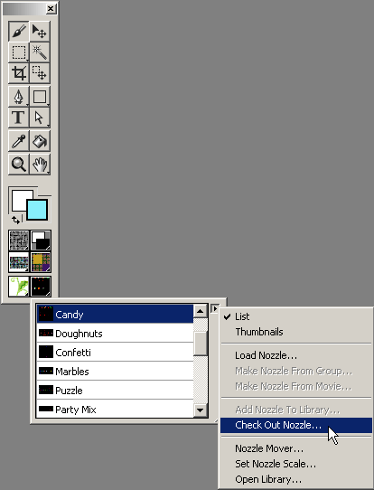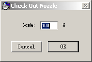 3.在nozzles面板的三角隐藏菜单中,选择Check out Nozzle(查看水管图像)。弹出的对话框中可以设定水管图像的缩放比例。按下OK按钮以后,我们看到水管图像其实是很多图像的集合。