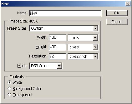 1.新键一个名字为眼球,尺寸为400*400相素,分辨率为72DPI,显示模式为RGB,背景色为白色的文件。