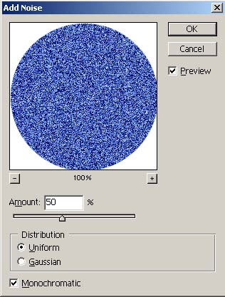 3. 保持圆圈选区,选择菜单filter(滤镜)/noise(噪点)/add noise(添加噪点),其中amount为50%,Distribution里将Uniform前面的选框选中,并将Monochromatic选中。
