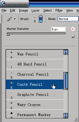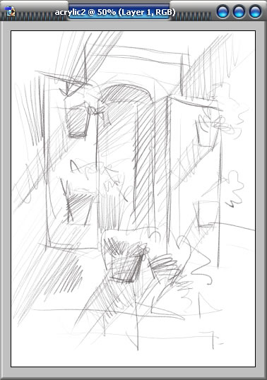 2.新建一层,切换到笔刷工具,载入Photoshop自带的Dry Media笔刷库,选择Conte Pencil 的笔刷。选择一种深灰色作为前景色,在新图层上进行疏松的草图绘制。不必担心局部的细节,把精力花在构图和光影、形状的设计上。Intuos 2数位板的精细压感会让草图的绘制更加流畅。