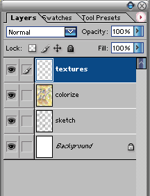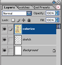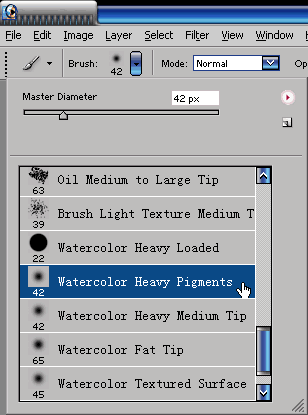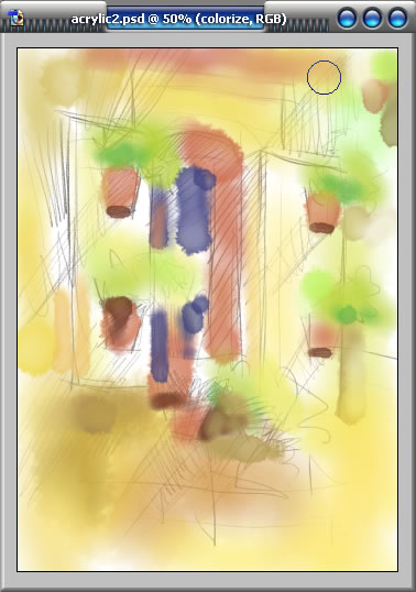 3.再新建一个图层,命名为colorize。载入Wet Media的笔刷库,选择Watercolor Heavy Pigents的笔刷上色。用薄涂的手法确定画面的基本色调。