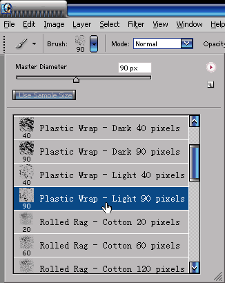4.继续新建一个图层,命名为textures,载入Faux Finish Brushes的笔刷库。选择Plastic Wrap-Light 90 pixels的笔刷,选用白色,在画面局部增加一些纹理效果。