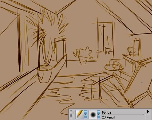2.新建一层,使用Pencils/2B Pencil画出初步的构思草图。