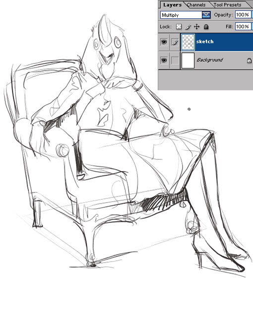 2.新建一层,设为Multiply的图层混合模式。使用一个7像素左右的笔刷,绘制基本的构思和造型轮廓。和纸上绘制创作草图一样,Intuos 3数位板提供了前所未有的舒适手感,让数字绘画的过程变得如此轻松和惬意。