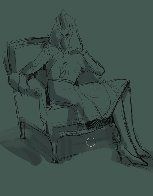 3.使用一种绿灰色填充背景图层,用100像素左右的标准圆头笔刷,把笔刷的不透明度调节到70%,进行阴影部分的描绘,确定整体的光线和体积关系。
