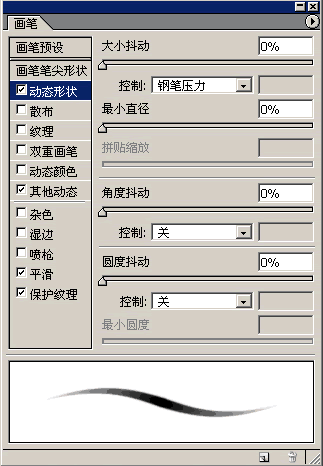 1.运行Photoshop 7软件,新建一个空白文件。调用一个合适画面像素的笔刷,调整画笔的动态形状的大小抖动与其他动态不透明度抖动为钢笔压力。