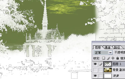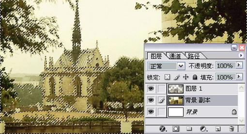1.打开Photoshop 软件,建立一个空白文件。把原先图片的图层复制下,选择一个合适自己的笔刷,调整到自己习惯的位置,先裁切下建筑部分,把天空部分先去掉。