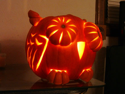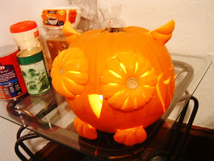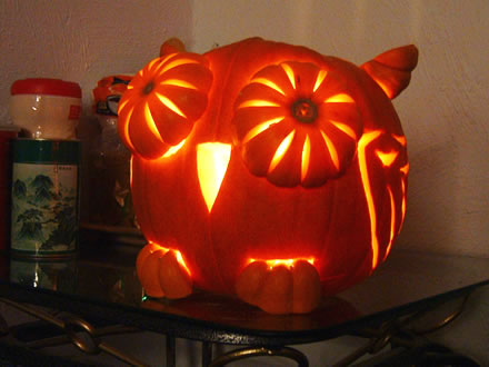 快到美国万圣节了。老美们都开始挑南瓜刻鬼脸。咱也凑热闹,玩点另类的让老外开开眼。 先来回顾下以前的作品吧。2002年 猫头鹰