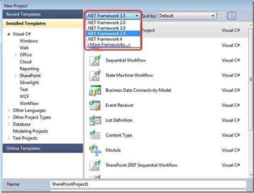 即使您已经开始使用最新的.NET运行时版本,您的客户可能还没有,或者您的应用程序可能是在以前的运行时版本上开发的,还没有准备好升级到.NET 4。使用Visual Studio 2010您可以选择将应用构建在.NET 2.0、.NET 3.0、.NET 3.5、或.NET 4上。新建项目对话框提供了选择目标.NET框架的版本或者在线寻找其他.NET框架的版本和配置的功能: