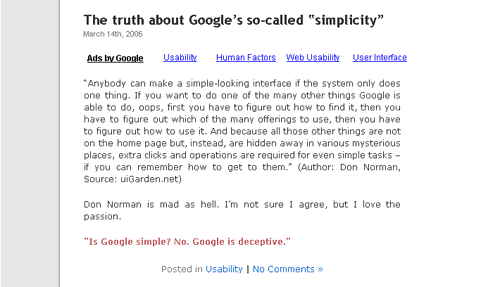 绝大多数广告是低价值的。一般来说,是不需要的。然而,如果做得很好,就像Google广告那样,用户就能够通过解答,解决方法和创意的方式得到他们确实需要的。Google背后所采用的使相关广告与当前内容相符的技术是可用性的一项独特资源。用户和出版商明显的依赖于这项由Google所提供的高度可用的技术。这可真是卓越的技术,杰出的用户体验。