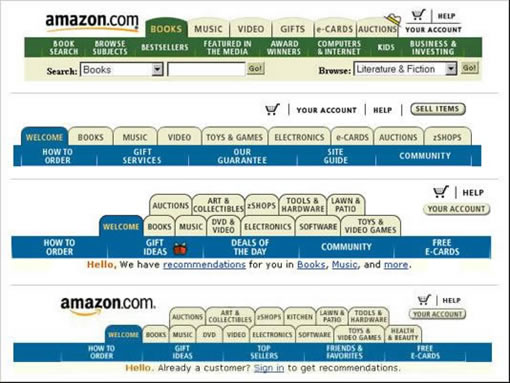 在网页设计中tab的使用一般认为是Amazon开了先河。相信大家很多人都读过LukeW的经典回顾文章:The History of Amazon’s Tab Navigation(中文版请猛击这里)。从这篇文章中我们可以看到,Amazon的导航从最初只有两个tab:Book和Music,演化到2000年最多的时候有两排tab。很显然,当tab数量增多的时候,tab这种交互方式遇到了一些困难。