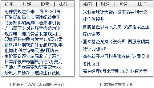 常规QVGA机型竖屏状态下,14号字体,单行仅显示13.5个字。资讯频道的新闻短标题要控制在13字以内才能在一行以内完整显示。标题折行会造成在相同空间承载信息量减少;频繁的眼动容易引起视疲劳;在视觉上带来无序松散的感受。