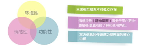 不知什么时候起有这样的一种说法,功能决定形态。易用的界面他一定是最简陋的。个人对这种说法是有点歧义的。因为功能不仅包括使用性功能,还包括审美性功能,环境性功能等等。它绝不是孤立存在的,反而我认为一个优秀的设计界面是以功能性为基础,情感性为重心,环境性为前提。三者相互联系不可能孤立存在。