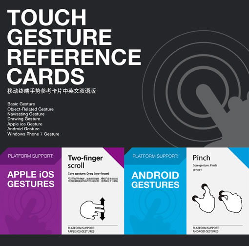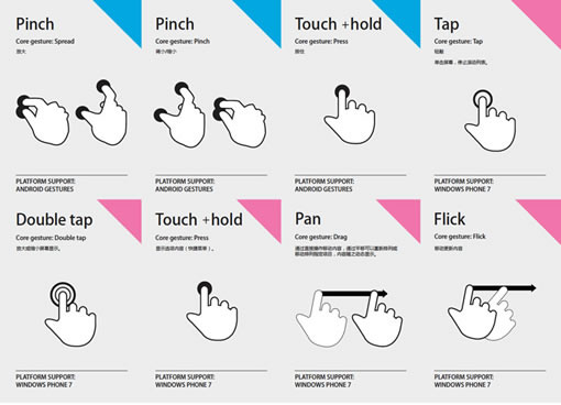 - 此份手势设计参考涵盖了当前移动客户端几大主流平台:即Apple iOS,Android,Windows Phone 7三大平台上主要使用的手势指令设计与相对应的用户操作行为。