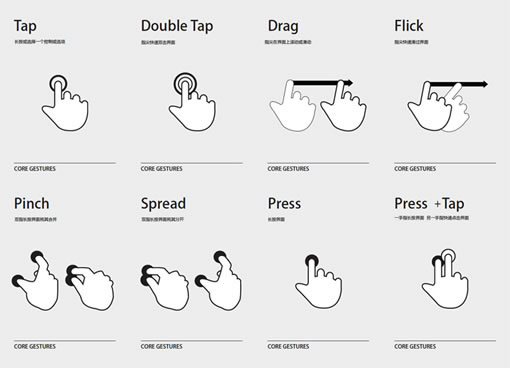 - 这份手势设计参考涵盖了当下大多数移动客户端用户经常使用到的操作手势。包括Core Gestures 触控操作核心手势,基本手势动作,基于对象的手势,基于导航的手势,以及绘制类手势,这几大手势类型所涵盖的具体操作表现。