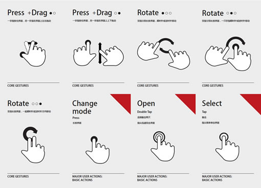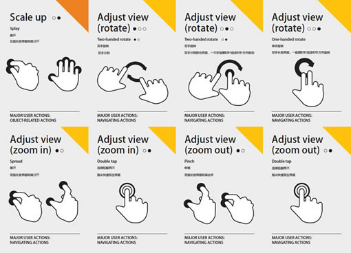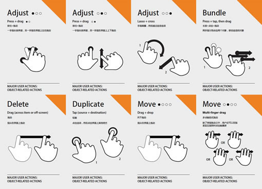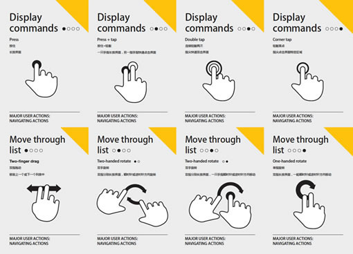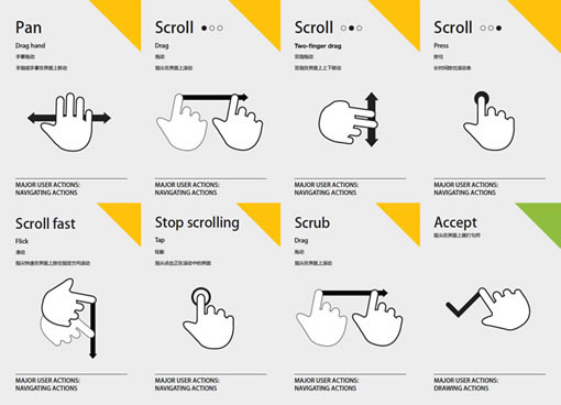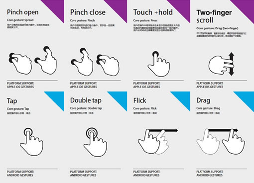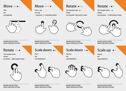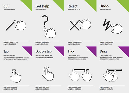 - 这份手势设计参考对用户主要使用的操作手势所指代的命令指示做出了一一对应的说明,能够很好地帮助移动客户端开发设计人士设计触控操作。