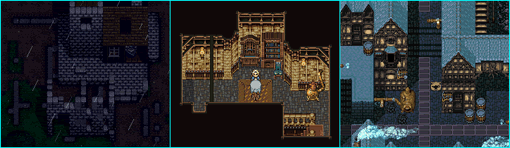 这两款游戏在避免栅格方面是可学习的典范。 你能在这些图里找出图块吗?有点困难,不是吗?这就是无缝拼接。你可以察觉到图块的排列,但是指出图块的起始和结束点就有难度了。第一张图中褐色的屋顶、第二张图中黄色的地毯、第三张图中井盖、炉子比较容易辨认。 其他的你能一下子找出来吗?