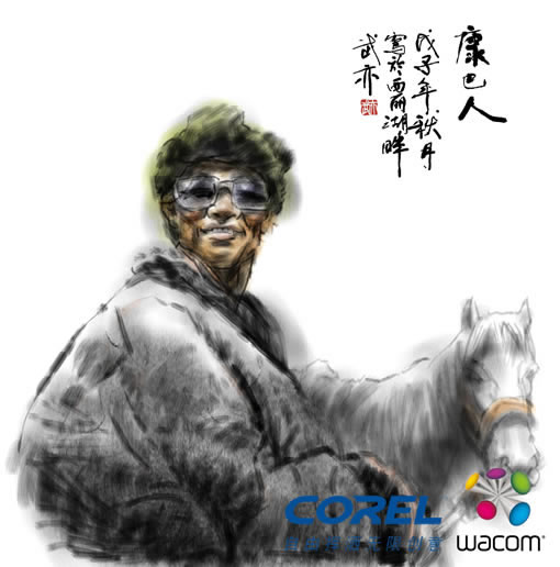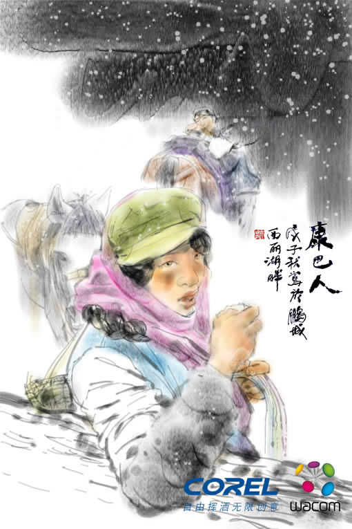 获得“2009 Corel创意设计大赛”特别奖的作品《康巴人》受到了评审的一致喜爱,获奖者曹武亦先生是深圳职业技术学院教授,自Corel Painter IX问世以来,一直着力于对数字水墨画技术的探索与研究,插画组画《康巴人》系列就是采用Corel Painter IX软件对中国传统水墨画效果的研究成果。作者在研究中充分利用现有的数字手绘板与液晶手绘屏等设备,对Corel Painter IX软件进行了仿中国传统水墨画笔墨技术的系统应用开发。