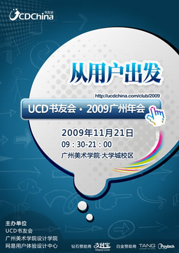 2009年11月,恰逢广州“UCD书友会”成立一周年,为了响应全国众多产品设计师的要求,我们计划在21日于广州美术学院大学城校区举办“UCD书友会•2009广州年会”。活动将围绕“从用户出发”这一主题,秉承“以用户为中心的设计”理念和宗旨,设置专家论坛、圆桌会议、工作坊、晚会等各种会议及探讨形式,给大家提供一个交流的机会与平台。