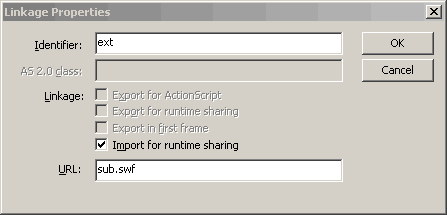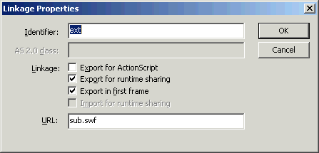 在sub.fla中,设置好需要attach元素的 Linkage值,并选定 Export for ActionScript 以及 Export in first frame这两项 然后,在sub.fla中新建一个空的mc, 在库中设置这个空mc的linkage值为 ext ,选定 Export in first frame 以及 export for runtime sharing, URL这一项则填写为 sub.swf 如图: