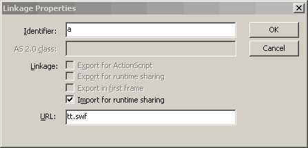我们打开主控文件mm.fla, 新建一个空mc,然后在库中设置linkage值为 a (或者b或者c,只要保持和tt.swf里面的某个linage值同名即可) ,然后选定 Import for runtime sharing , URL一项填为 tt.swf,如图: