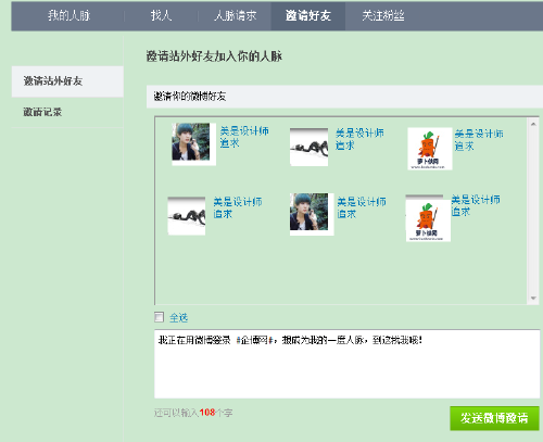 企博网针对人脉,新增 两项功能 :微博邀请好友、链接邀请好友