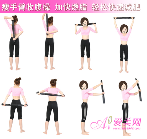 2、双脚呈立正姿势站立,身体挺直,右手握着毛巾的一端抬起至头部的高度,左手握着毛巾的中间位置,然后右手向左边拧毛巾,左手向右边拧毛巾,吸气收腹,动作持续20秒。