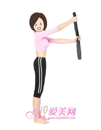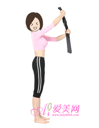 1、双脚呈立正姿势站立,身体挺直,右手握着毛巾的一端抬起至头部的高度,左手握着毛巾的中间位置,双手手臂伸直,吸气收腹,动作持续20秒。