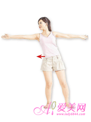 双脚打开与肩同宽,膝盖微微的弯曲。双臂从两侧向上平举至与肩同高,将掌心朝下。