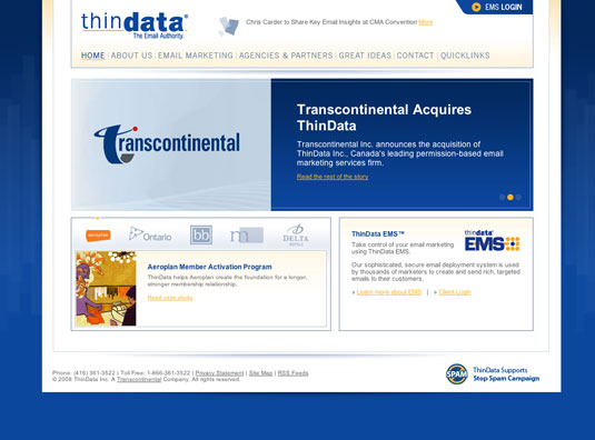 ThinData continues to accomplish this by providing clients email strategy, email creative and the proprietary industry-leading email marketing software ThinData EMS™. ThinData is recognized for its leading Internet Service Provider (ISP) relations expertise and publications including, The Marketer's Guide to Successful Email Delivery. ThinData's customers are some of North America's most recognized brands, including Aeroplan, Air Canada, Bank of Montreal, Sympatico / MSN, CBC, Canadian Blood Services, Delta Hotels, Points.com, Indigo, Cineplex, M&M; Meats and Blockbuster Canada.