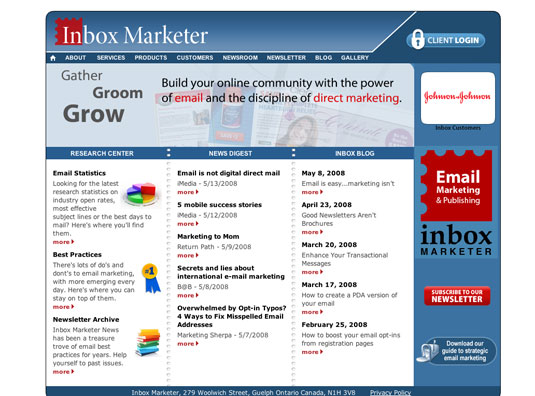 Inbox Marketer Inc. continuously fine-tunes the email dialogue that takes place between its customers and their clients, using proven direct marketing and publishing techniques. Inbox expertise lies in email publishing, database marketing, lead generation and Web search engine optimization - skills it combines into effective marketing communications programs for private, public and not-for-profit organizations.