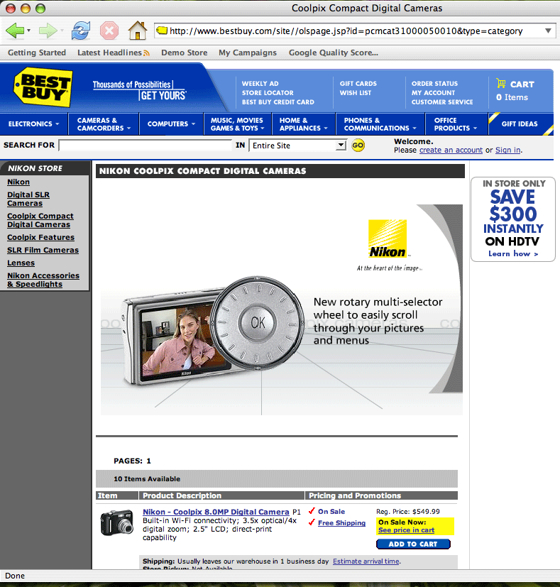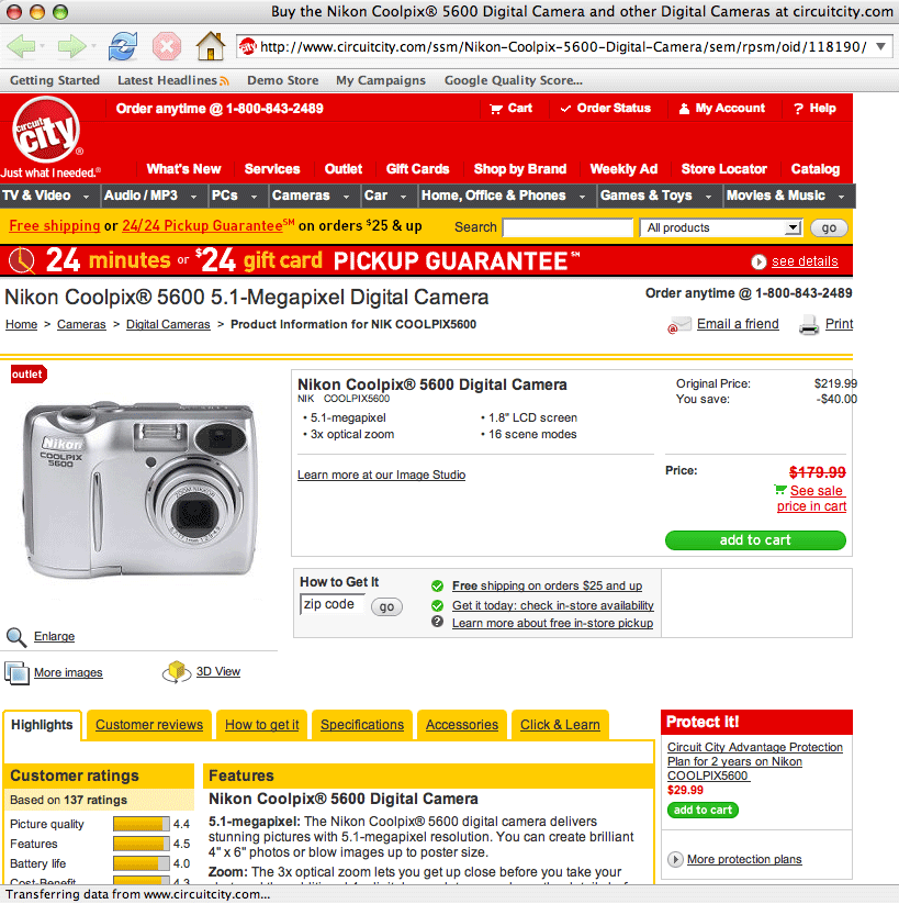 The Best Buy offer page for the keyword “Nikon Coolpix,” for example, has an “Add to cart” button that is small and below the fold and is, in fact, nearly impossible to find, while Circuit City’s “Add to cart” button is bigger, brighter, and in a more visible area of the page. (To see the full-size image, click on the image.)